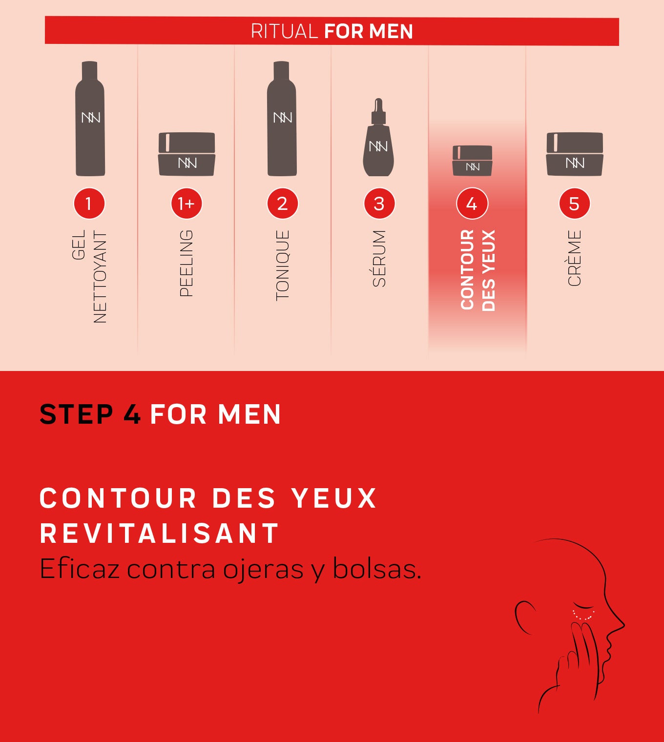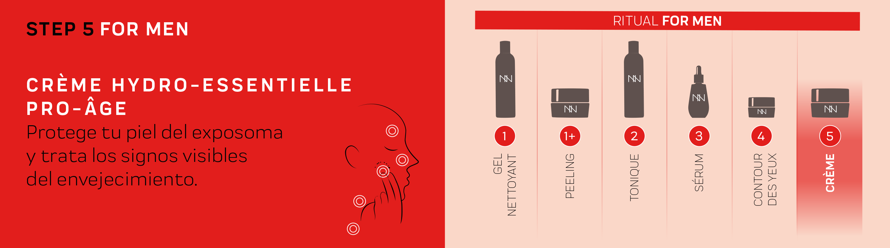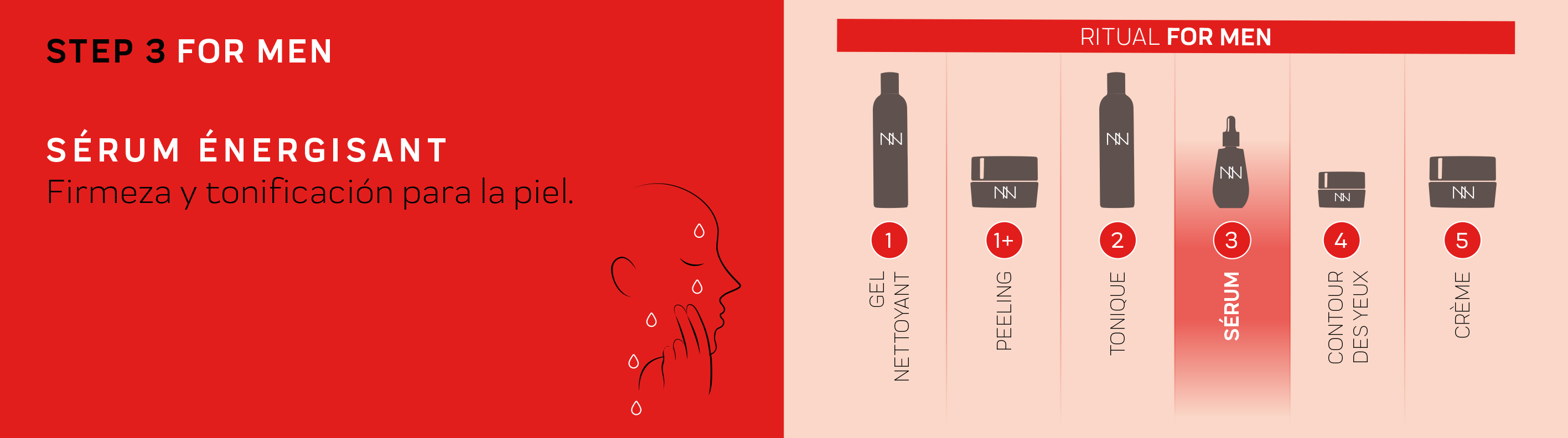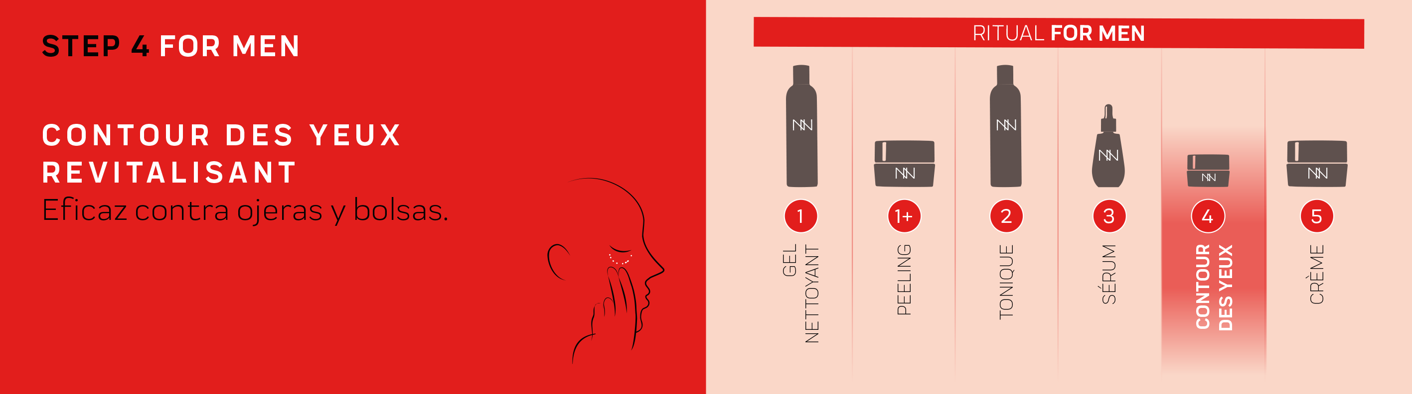 Before starting, it is important to properly cleanse and prep your face with the Gel Nettoyant and Tonique FOR MEN. Our facial routine for men then continues with applying the Contour Des Yeux Revitalisant, and the Crème Hydro-Essentielle Pro- Âge. And with that you’ve finished the routine, try it and see how effective it is!