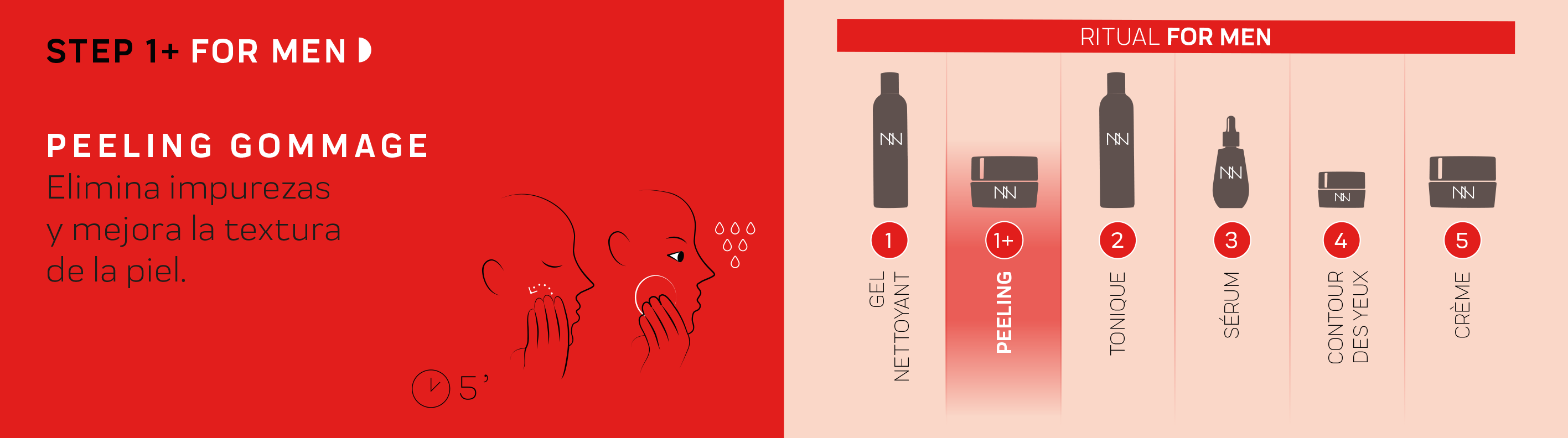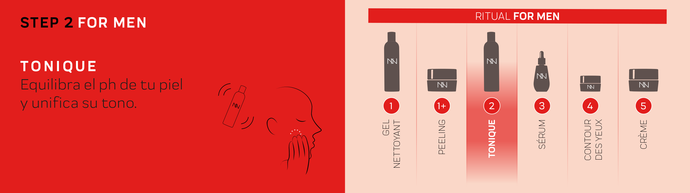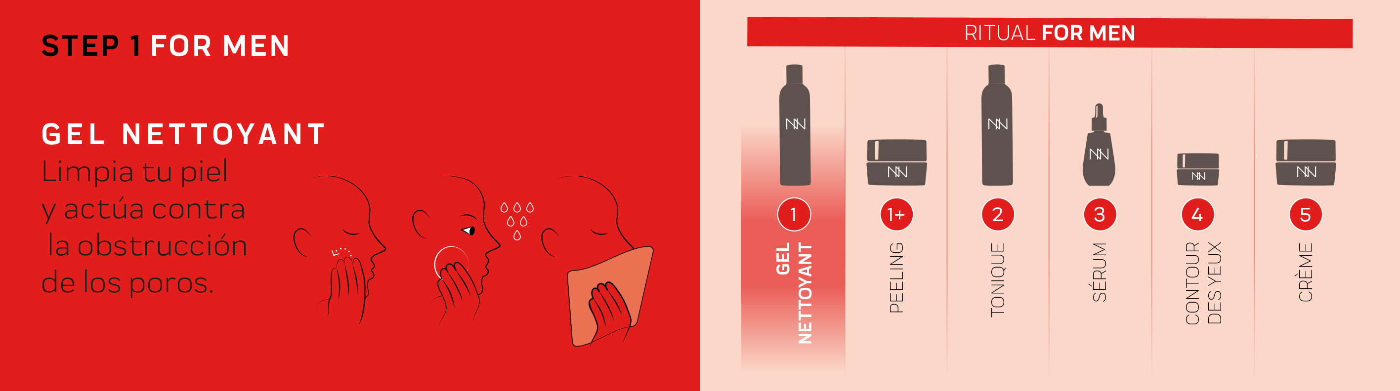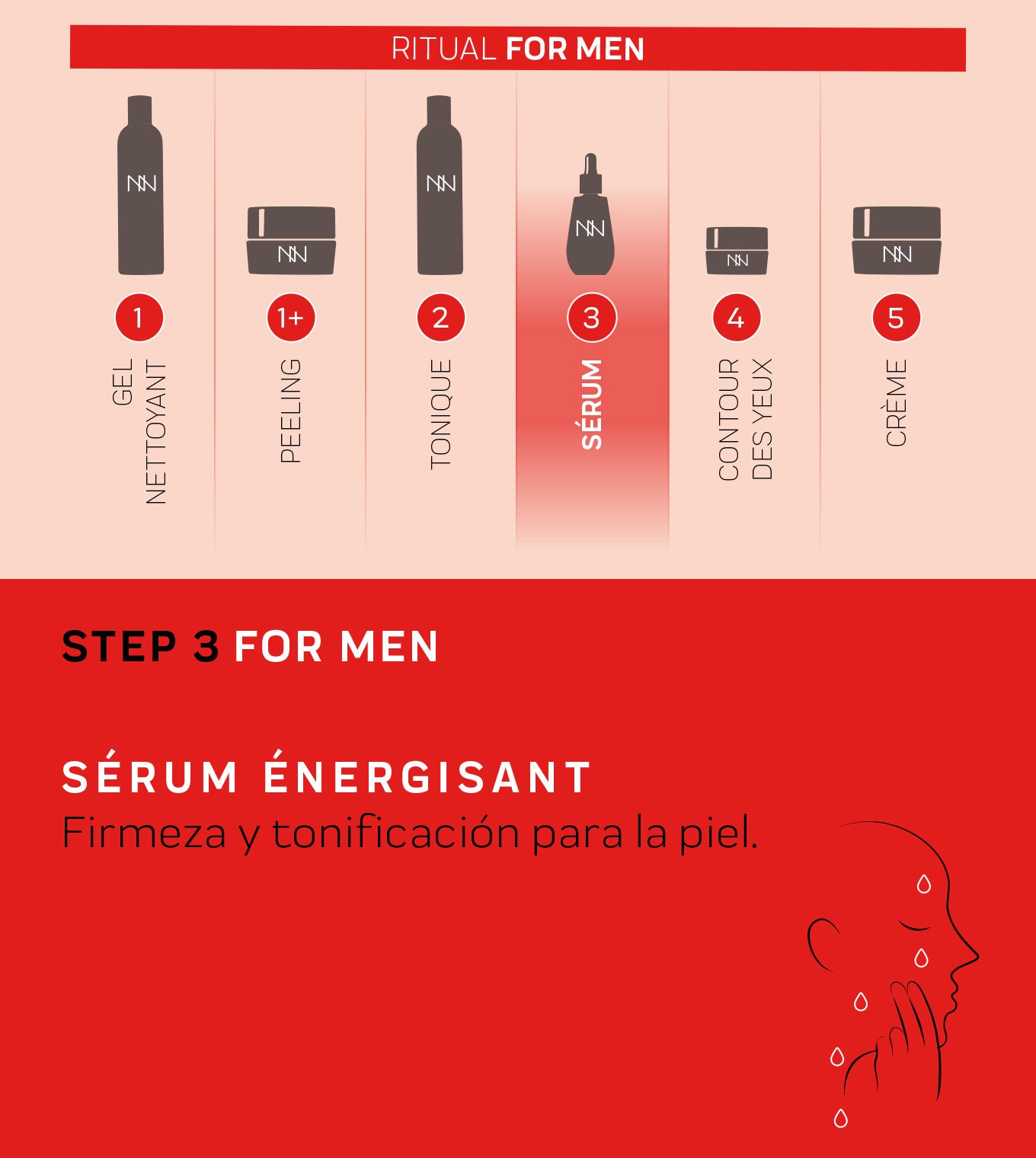 Before starting, it is important to properly cleanse and prep your face with the Gel Nettoyant and Tonique FOR MEN. Our facial routine for men then continues with applying the Contour Des Yeux Revitalisant, and the Crème Hydro-Essentielle Pro- Âge. And with that you’ve finished the routine, try it and see how effective it is!
