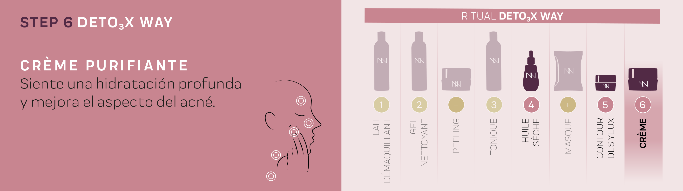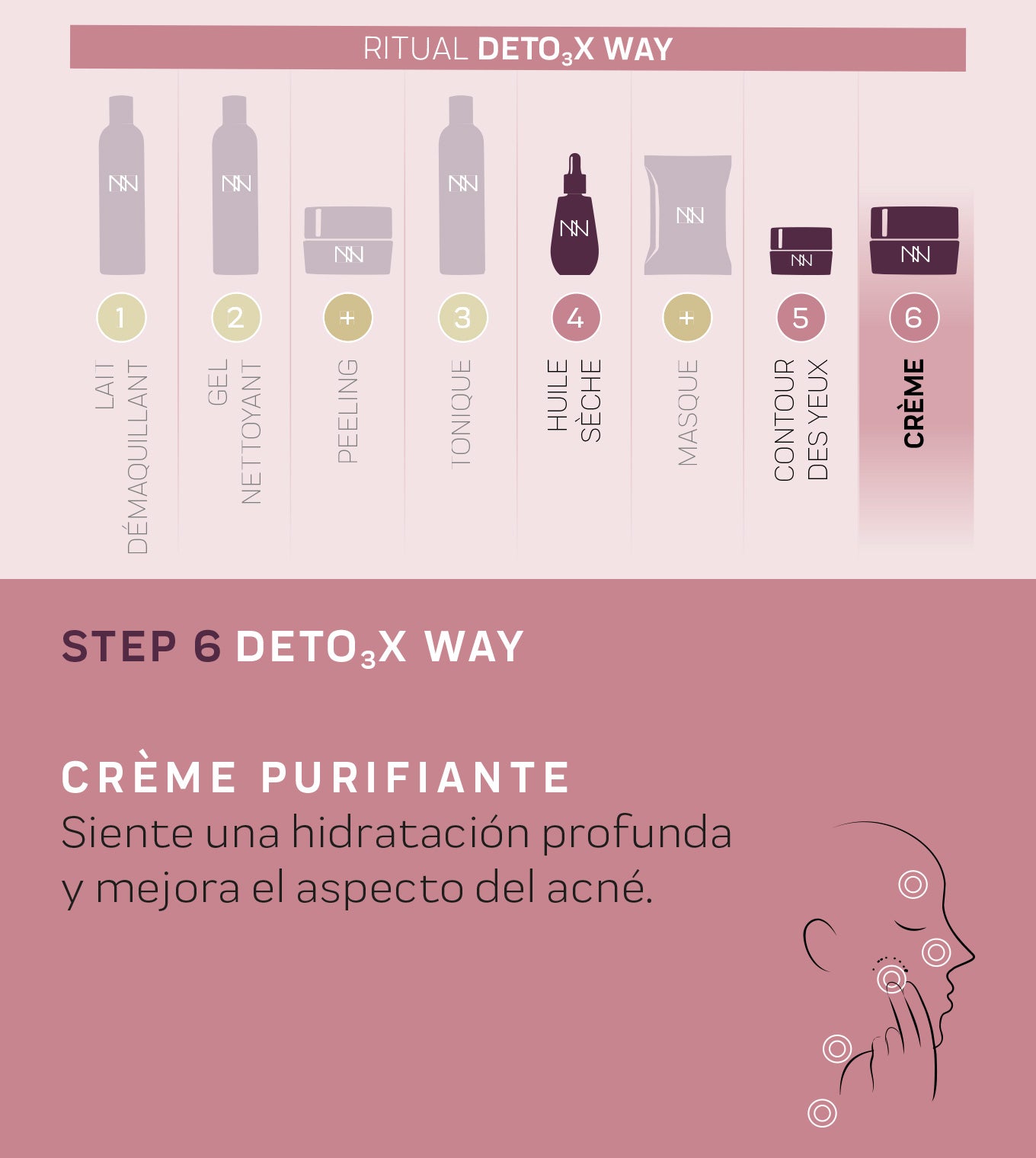 Antes de empezar, es importante limpiar y preparar correctamente la piel de tu rostro con los tres pasos del ritual Essential Clean. Nuestra rutina para piel grasa continúa con la aplicación del Huile Sèche Sébo-Régulatrice y posteriormente, el Contour Des Yeux Purifiant y Crème Purifiante. Ya has finalizado la rutina para piel grasa Deto3x Way. ¡Ahora, a disfrutar de sus beneficios!